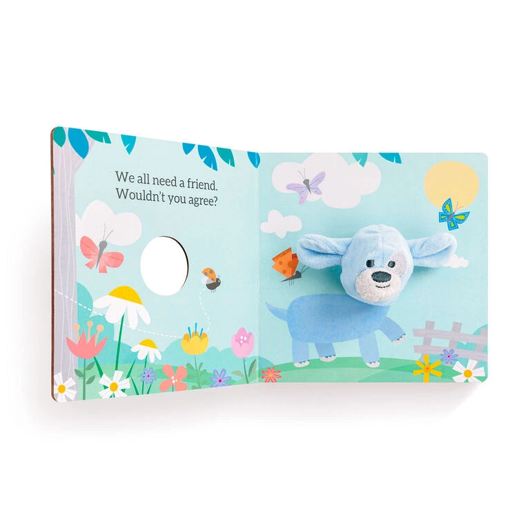 - The Friendly Puppy board book from Demdaco features a plush puppy finger puppet.
