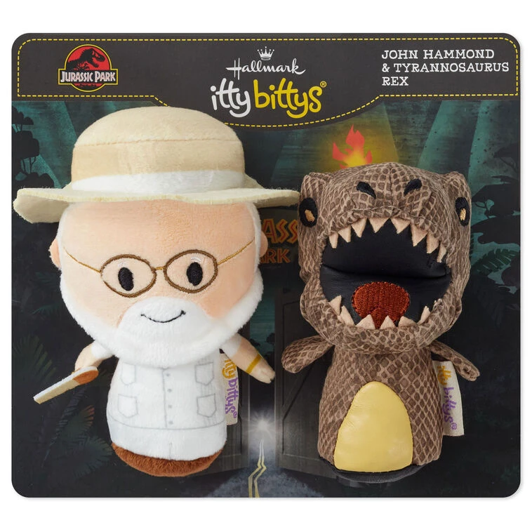 - itty bittys Jurassic Park plush set includes 2 characters crafted from soft fabric: John Hammond and Tyrannosaurus Rex.